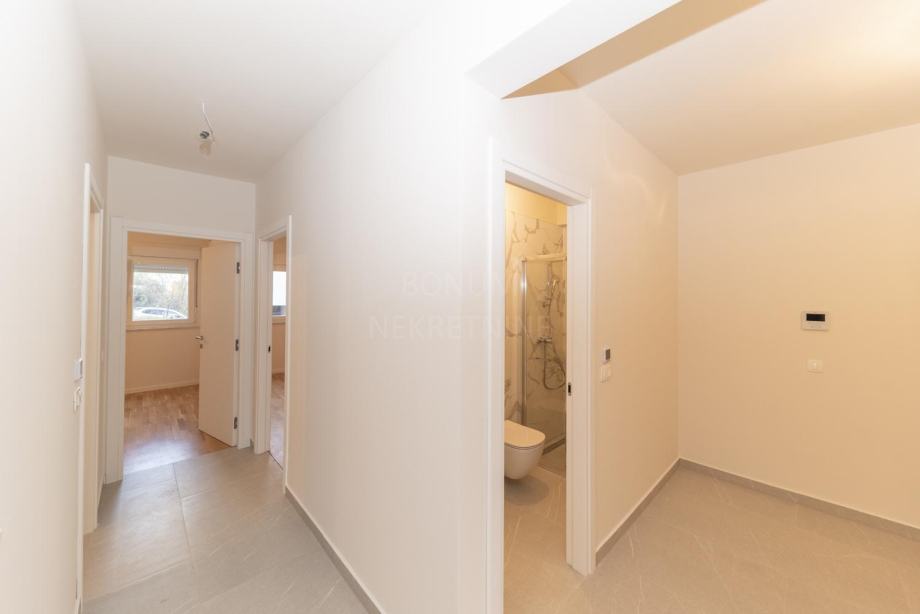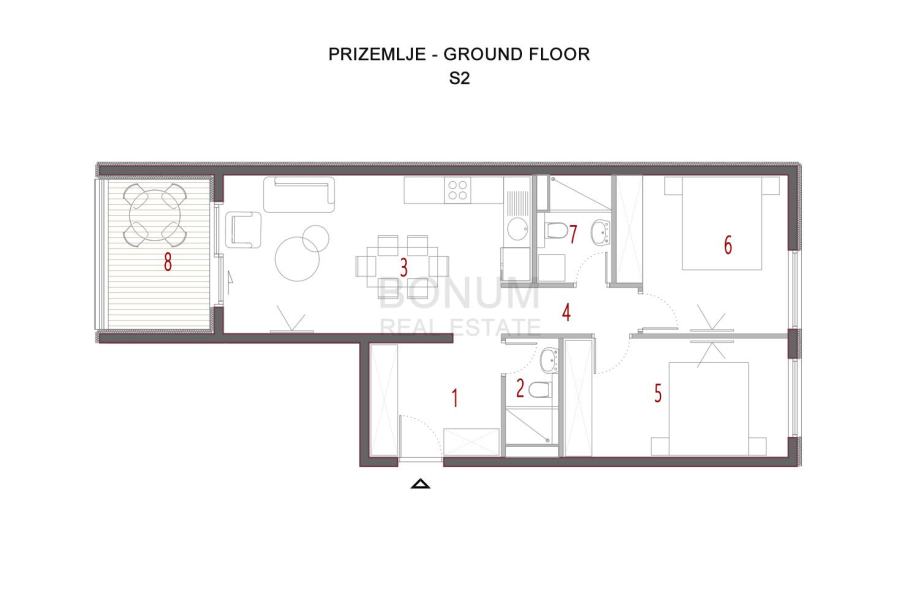 S2 - prizemlje, sastoji se od ulaznog prostora, dvije spavaće sobe, dnevnog boravka s kuhinjom i blagovaonicom, dvije kupaonice i hodnika, površine 69,09 m2, s lođom površine 8,16 m2, kojem pripada garažno parkirališno mjesto u dvorištu oznake P4 površine 12,50 m2.