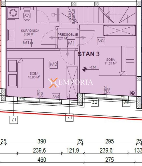 Udaljenost od centra mjesta je 800 m.OpremaGradnja se vrši ciglenim termo blokom i betonskim zidom. Termoizolacija fasade je 10 cm stiropor. Prozori su aluminijski s troslojnim staklom, roletama i komarnicima. Podne obloge su pločice i parket. U dnevnom boravku i spavaćim sobama bit će postavljeni klima uređaji. Osim toga, u kupaonici će biti postavljeno podno električno grijanje.