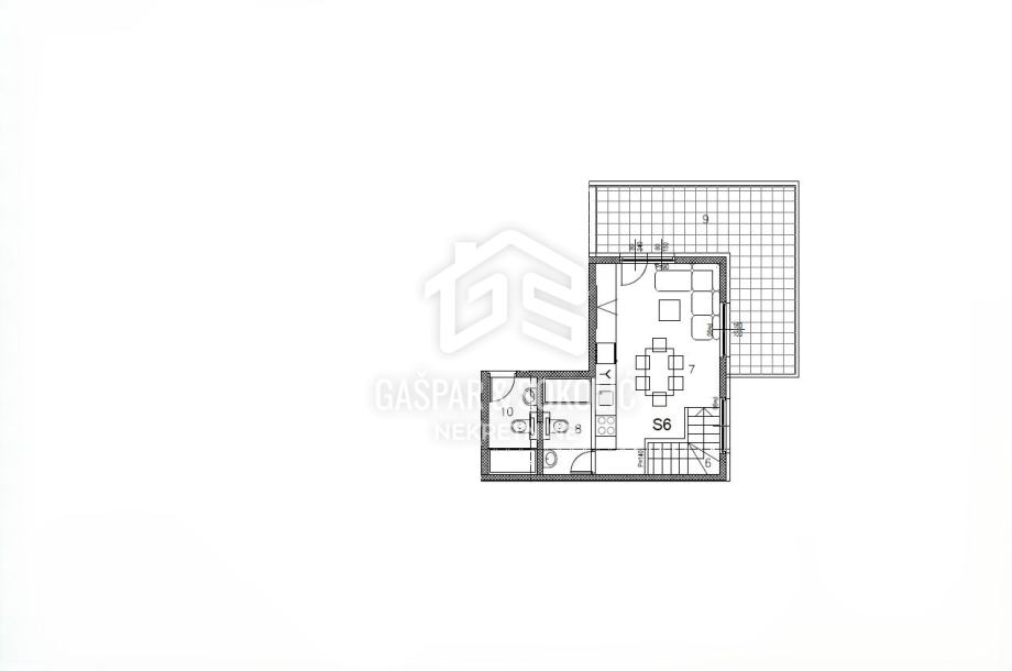 Stan S6 (70,46 m²) moderno je koncipiran dvoetažni trosobni stan sa dvije spavaće sobe, dnevnim boravkom s kuhinjom i blagovaonicom, dvije kupaonice i terasom od 17,81 m², nudeći kombinaciju komfora i luksuza. Obavezna kupnja garažnog parkirnog mjesta površine između 13,70 m2-17,70 m2, ovisno o preferencijama i raspoloživosti.