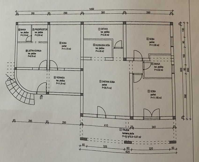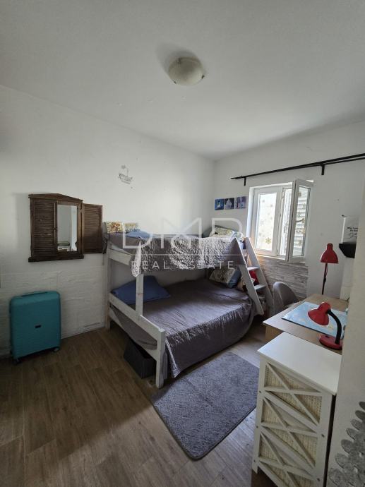 Nekretnina se sastoji od 80m2 stana te oko 30m2 neuređene (roh bau) garsonijere.