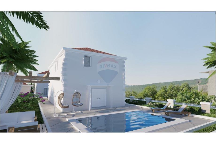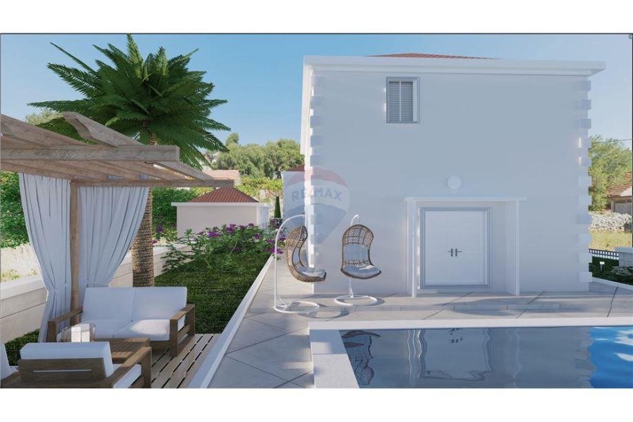 - Dnevna soba, kuhinja, wc, 2 x garažna parkirna mjesta plus 2 x vanjska parkirna mjesta, bazen 8mx4m