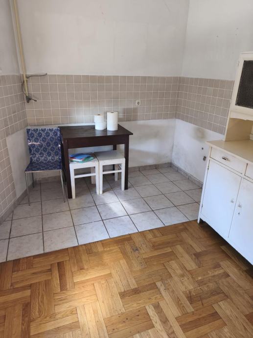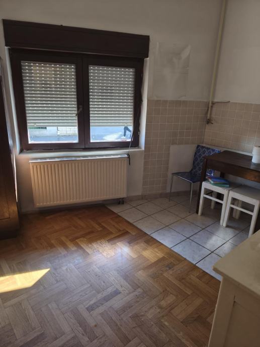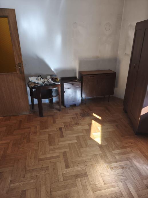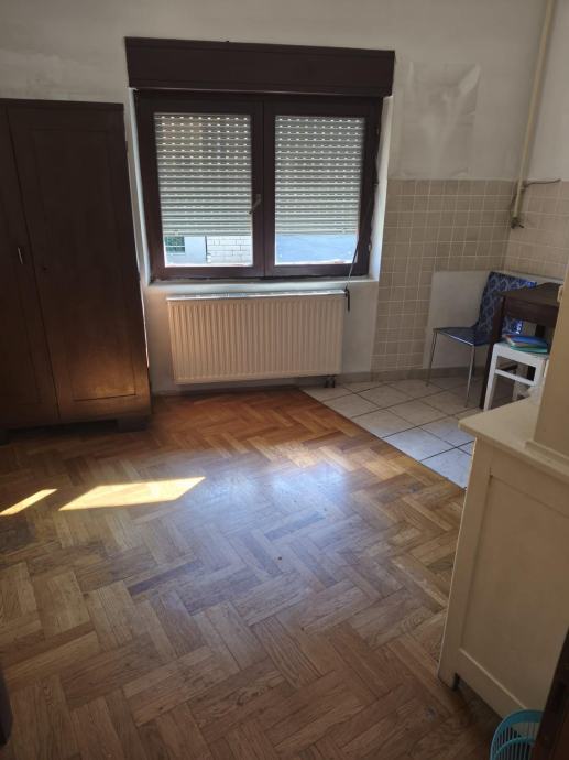 Glavni prostor ima parket položen u riblja kost i prozor s roletama koji propušta prirodno svjetlo. Pod je djelomično pokriven keramičkim pločicama u dijelu bližem kuhinji. Zidovi su u originalnom stanju i vidljivo je da stan nije renoviran u novije vrijeme.
