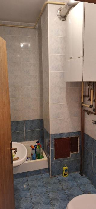 Kupaonica s WC-om opremljena je umivaonikom i kadom, a u njoj se nalazi i plinski bojler koji služi kao dio etažnog plinskog centralnog grijanja. Pločice su plave i sive nijanse, s vidljivim cijevnim instalacijama.