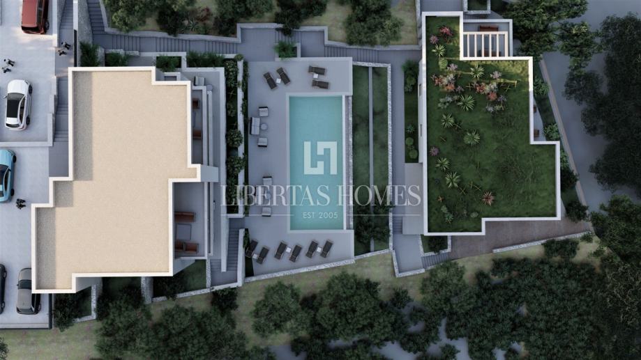 Zemljište je podijeljeno na dvije zasebne parcele – jednu površine 808 m² i drugu površine 877 m² – što omogućuje neovisnu izgradnju dviju kaskadnih vila s vlastitim pristupom i visokim stupnjem privatnosti. Teren ima prirodnu padinu, što dodatno pogoduje atraktivnom arhitektonskom rješenju i otvorenom pogledu.