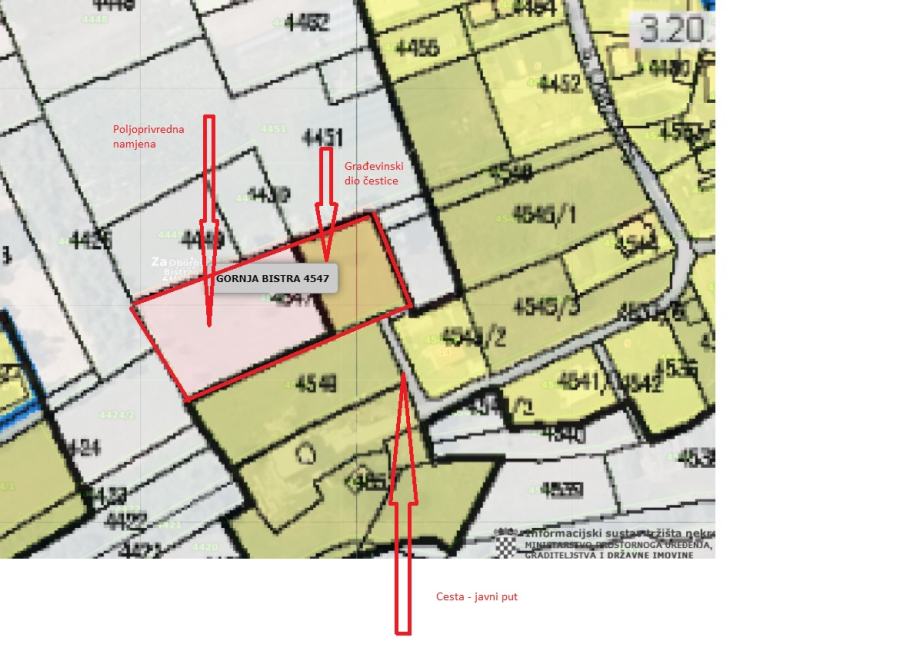 Dio zemljišta ulazi u građevinsko područje i može se ishoditi građevinska dozvola, dok je ostatak zemljišta poljoprivredne namjene (*predan je zahtjev za promjenu namjene u građevinsko područje cijele kat. čestice 4547, odnosno da cijela površina od 2867 m2 bude građevinsko zemljište. Donošenje IX. izmjena i dopuna Prostornog plana uređenja Općine Bistra očekuje se do 31.12.2025.).
