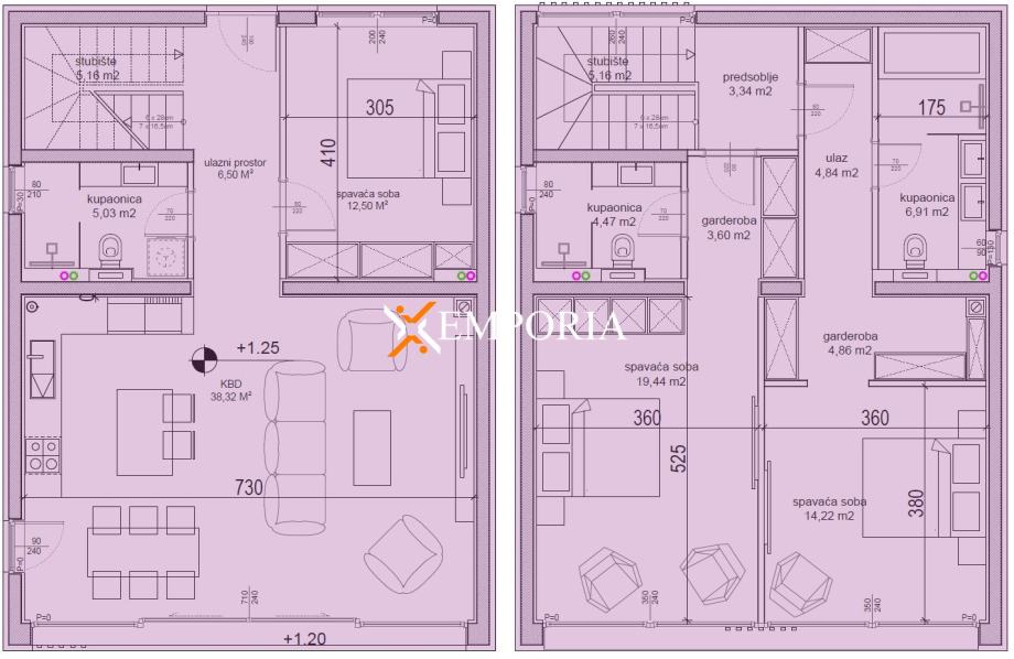 Raspored prostorija čine prizemlje, hodnik, spavaća soba, kupaonica, kuhinja s blagovaonicom i dnevnim boravkom, nenatkrivena terasa. Unutarnjim stepenicama se ide na kat gdje se nalazi hodnik, dvije spavaće sobe, svaka sa kupaonicom i garderobom.