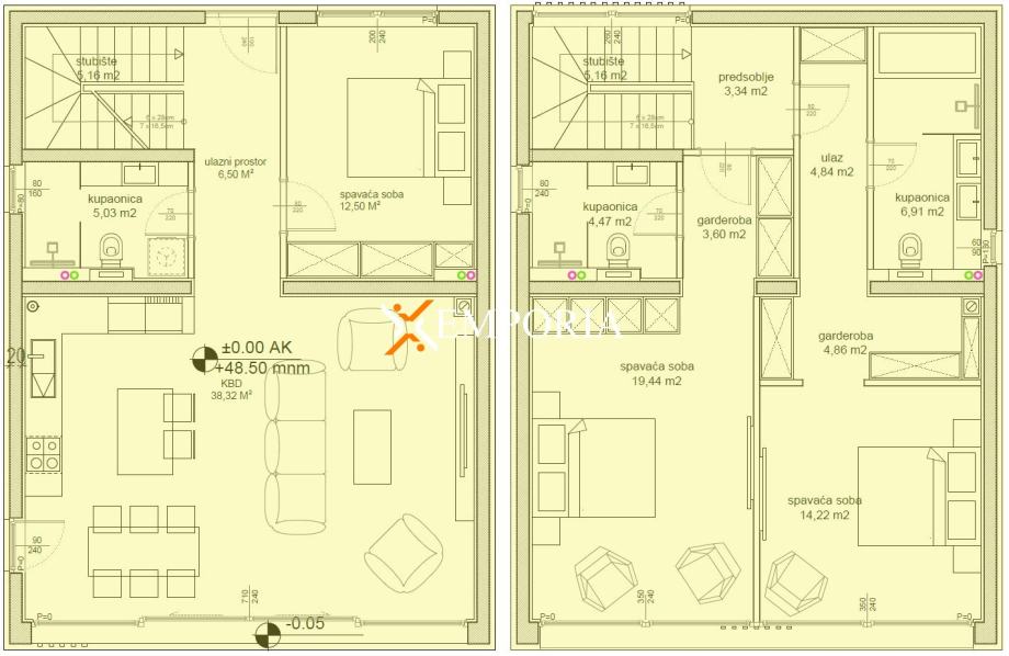 Raspored prostorija čine prizemlje, hodnik, spavaća soba, kupaonica, kuhinja s blagovaonicom i dnevnim boravkom, nenatkrivena terasa. Unutarnjim stepenicama se ide na kat gdje se nalazi hodnik, dvije spavaće sobe, svaka sa kupaonicom i garderobom.