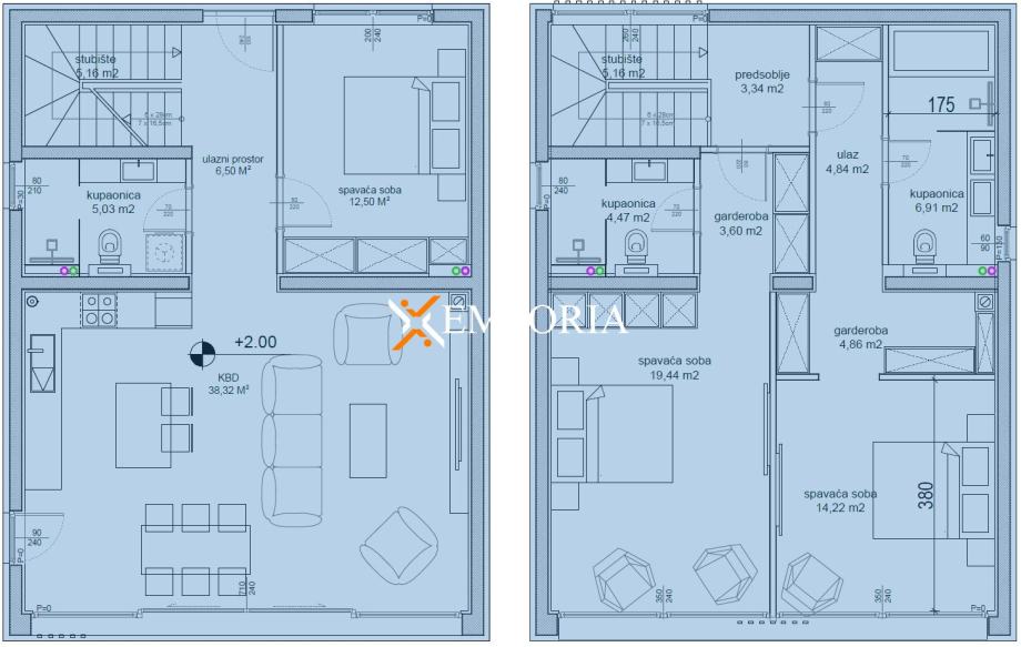 Raspored prostorija čine prizemlje, hodnik, spavaća soba, kupaonica, kuhinja s blagovaonicom i dnevnim boravkom, nenatkrivena terasa. Unutarnjim stepenicama se ide na kat gdje se nalazi hodnik, dvije spavaće sobe, svaka sa kupaonicom i garderobom.