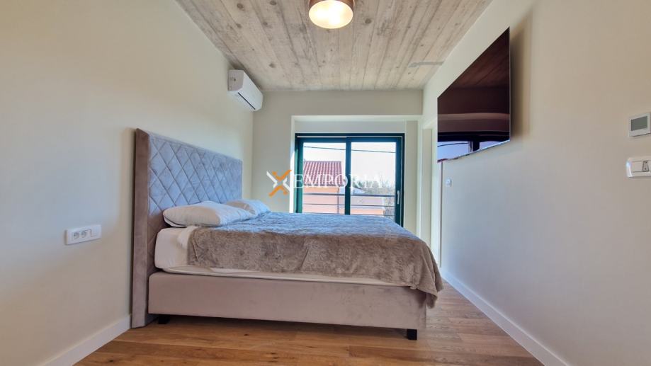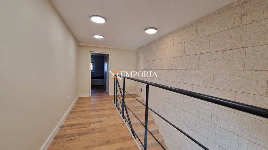 Kuća se sastoji od prizemlja i prvog kata. Raspored prostorija u prizemlju čine hodnik, kuhinja s blagovaonicom, zasebni dnevni boravak, WC s praonicom i nenatkrivena terasa površine 25 m2. Unutarnje stepenice vode na prvi kat gdje se nalazi hodnik, spavaća soba s kupaonicom te spavaća soba s kupaonicom i garderobom.Ukupna površina kuće iznosi 167,02 m2, dok ukupna površina s bazenom iznosi 188,02 m2. Kuća je smještena na zemljištu površine 266 m2.Pokraj bazena nalazi se ljetna kuhinja površine 16 m2 s roštiljem.Dvorište krasi bazen od 21 m2, obložen mozaikom, s pripremom za grijanje i vanjskim tušem uz bazen.