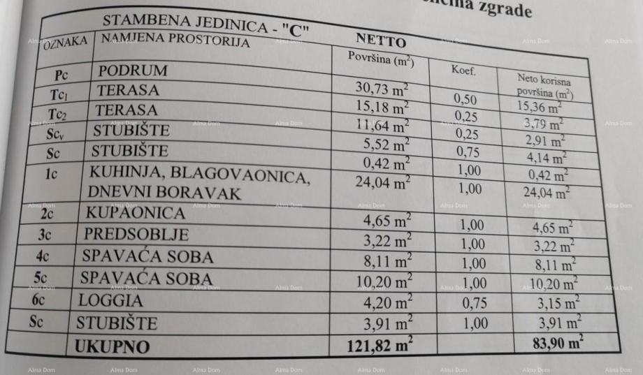 Stan ima 83,90 m² stambenog prostora i raspoređen je na dvije etaže.