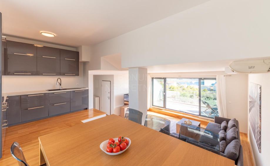 Apartman se sastoji od ulaznog dijela koji se nastavlja na prostrani dnevni boravak s kuhinjom i blagovaonicom u jednoj cjelini iz kojeg se izlazi na terasu s koje se pruža prekrasan panoramski pogled na more. U drugom dijelu se nalaze tri spavaće sobe, od kojih jedna ima zasebnu kupaonicu te terasu s pogledom na more, zatim još dvije kupaonice te jedna velika terasa sa stražnje strane apartmana.
