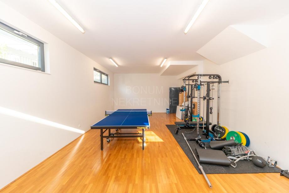 U prizemlju zgrade nalazi se velika teretana površine 46,45 m², koja također pripada ovom apartmanu, te garaža koja se nalazi s druge strane.
