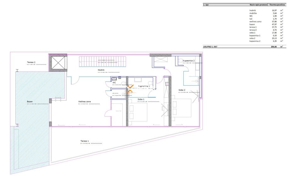 U podrumu (162,11 m²) nalazi se teretana, strojarnica, igraona (biljar, pikado, stolni nogomet, video igrice) i kućno kino, idealno za opuštanje i zabavu s obitelji i prijateljima. Prizemlje (284,43 m²) uključuje hodnik, kuhinju s blagovaonicom i dnevnim boravkom, WC te nenatkrivenu terasu. Na prvom katu (206,66 m²) smješteni su hodnik, dvije luksuzne spavaće sobe s vlastitim kupaonicama, dvije natkrivene terase, wellness prostor, sauna i unutarnji bazen (47,97 m²) koji se proteže prema vanjskoj terasi i može se potpuno zatvoriti staklom. Drugi kat (151,87 m²) uključuje hodnik, četiri prostrane spavaće sobe, svaka s vlastitom kupaonicom, te natkrivenu terasu s koje se pruža nevjerojatan pogled na more.