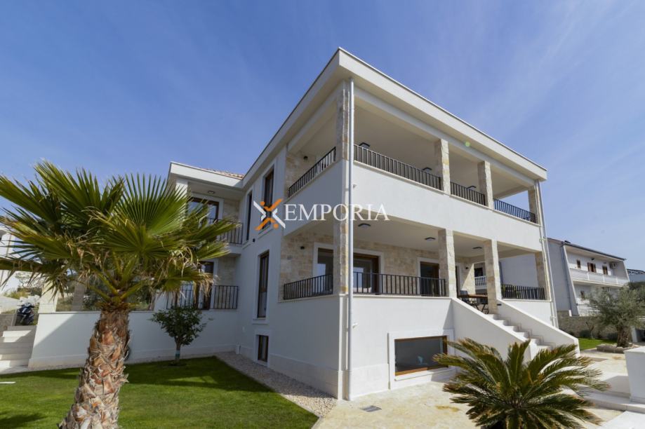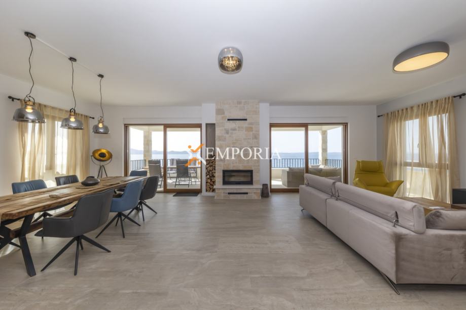 The villa is located in the first row, with a stunning view of the Adriatic Sea and the islands. It consists of a basement, ground floor, and first floor.