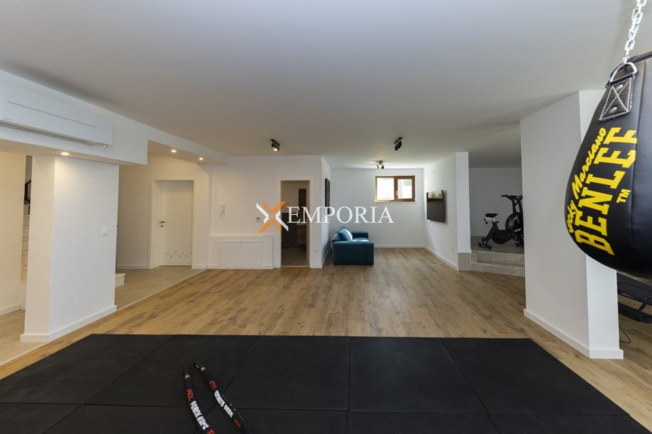 U podrumu se nalaze kotlovnica, praonica, kupaonica, fitness prostor, prostor za odmor i predviđeni prostor za saunu. U prizemlju su kupaonica, ured, veliki dnevni boravak i blagovaonica, kuhinja, ostava, garaža i natkrivena terasa s pristupom vrtu. Na prvom katu nalazi se hodnik, dvije glavne spavaće sobe s kupaonicama i pristupom natkrivenoj terasi, dvije bočne spavaće sobe s kupaonicama i balkonima. Ukupna površina kuće iznosi 446,80 m2. Površina zemljišta iznosi 696 m2.