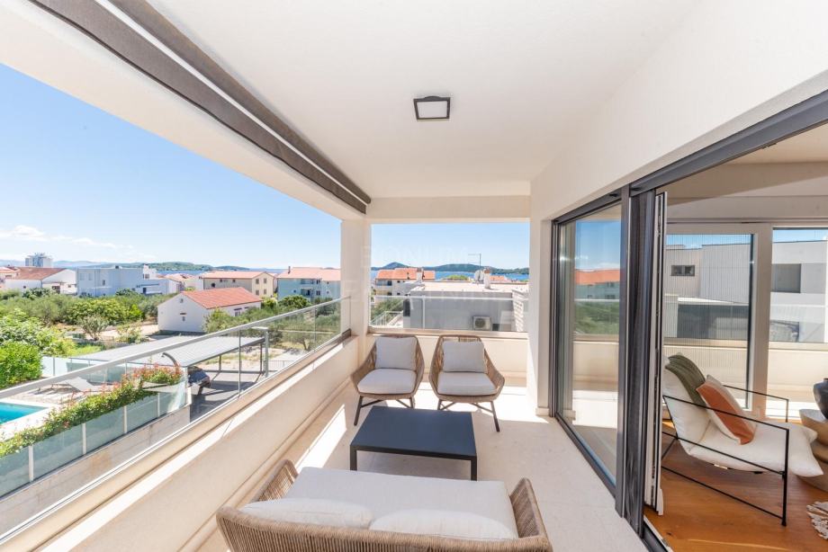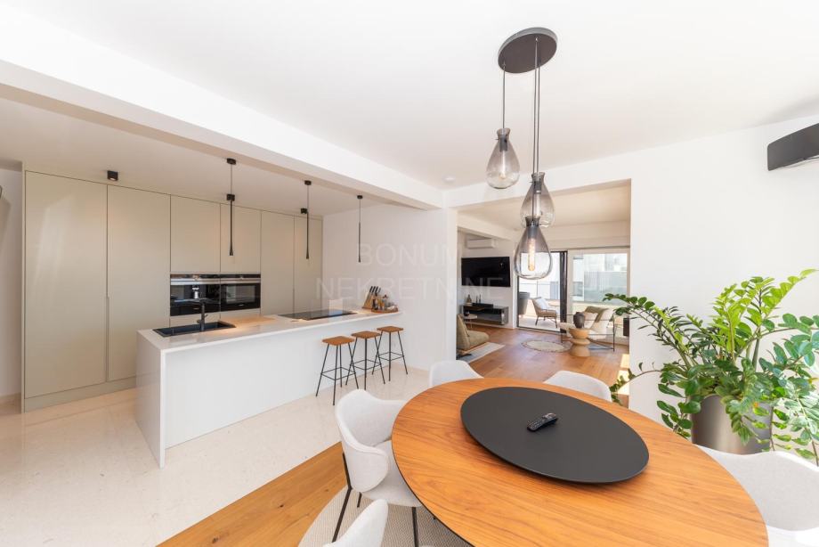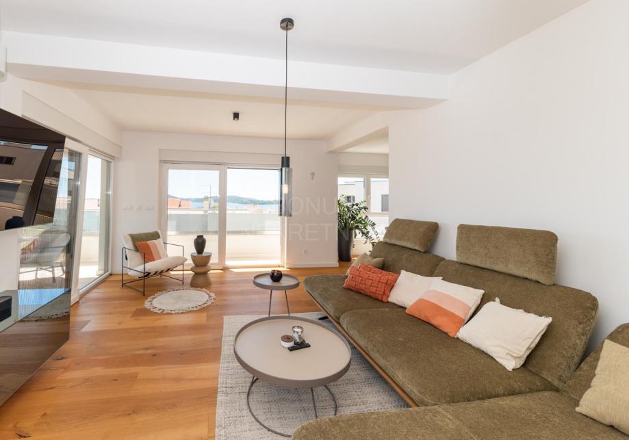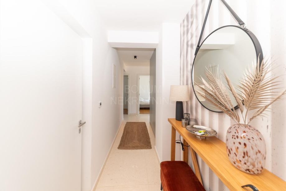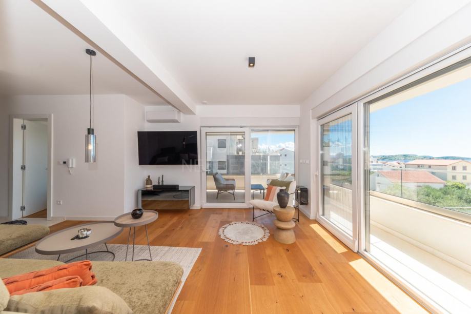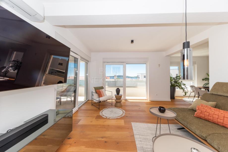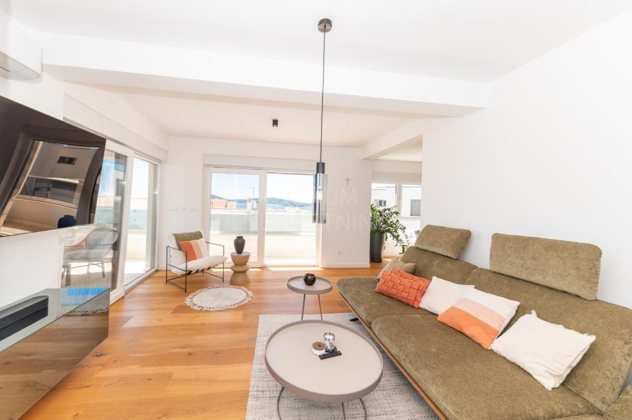 Prodaje se luksuzan apartman u Vodicama, stambena jedinica smještena na prvom katu manje zgrade s ukupno tri stana. Stan ima ukupnu podnu površinu od 109,83 m² i sastoji se od dva hodnika, spremišta, dnevnog boravka, kuhinje s blagovaonicom, četiri spavaće sobe i dvije kupaonice. Prostor je osmišljen tako da pruža maksimalnu udobnost i funkcionalnost za obiteljski život, a istovremeno je izvrsna investicija za turistički najam.