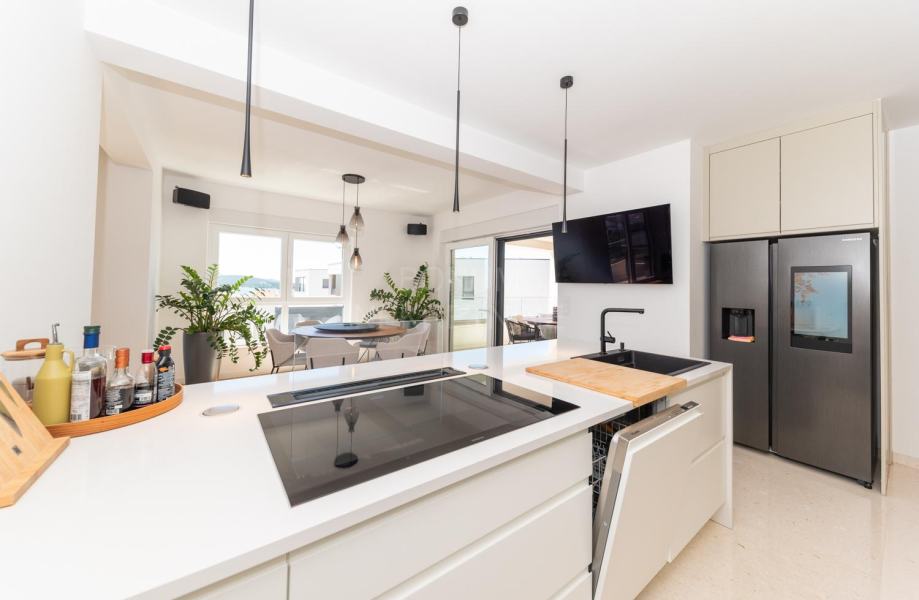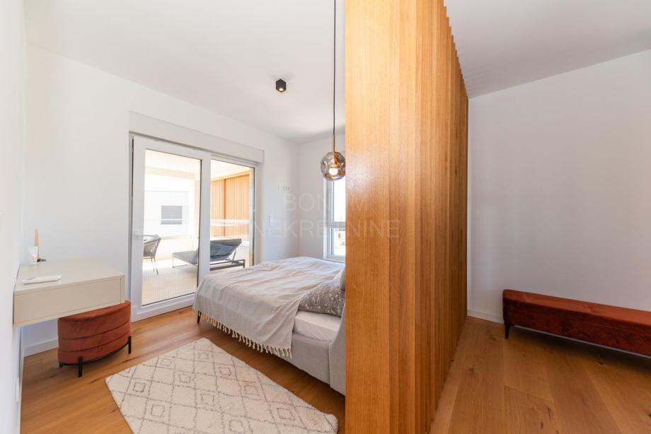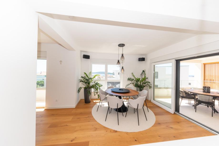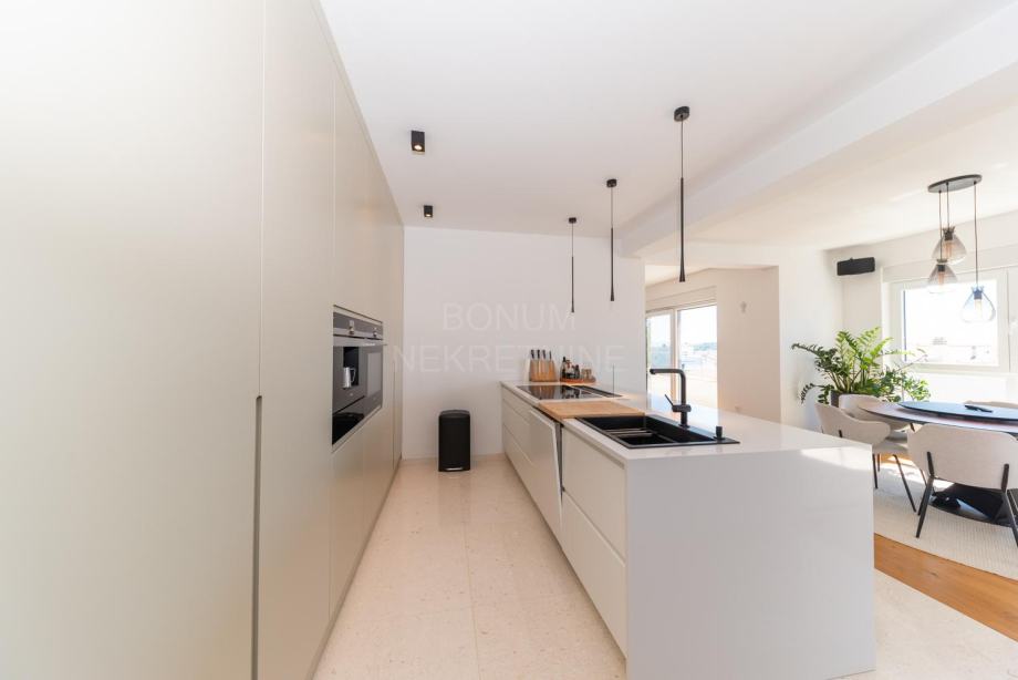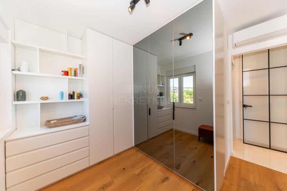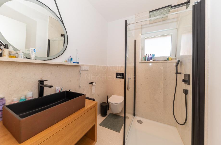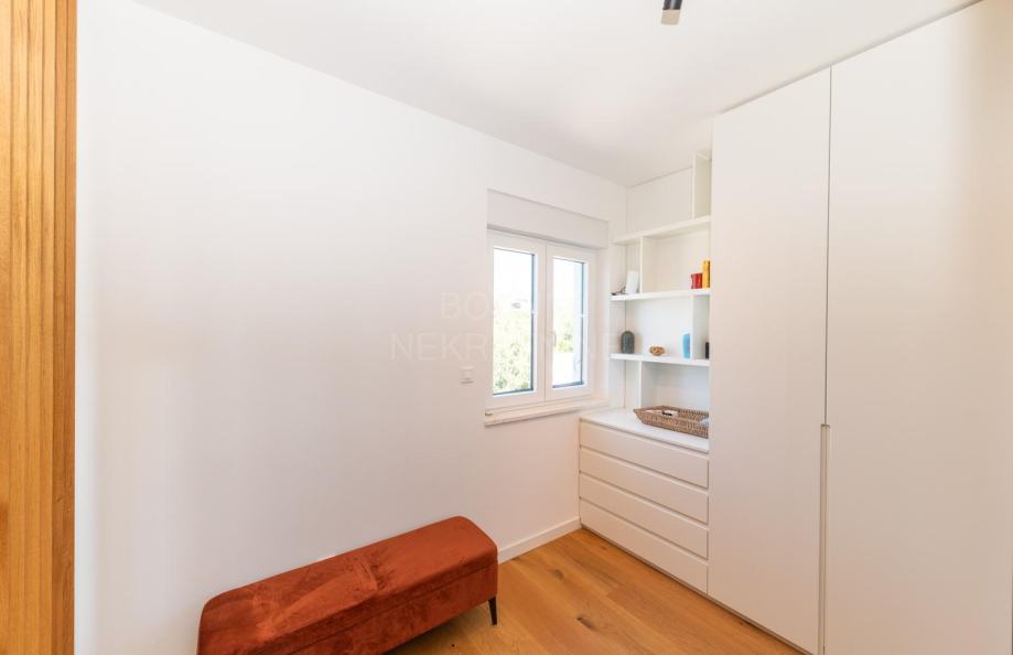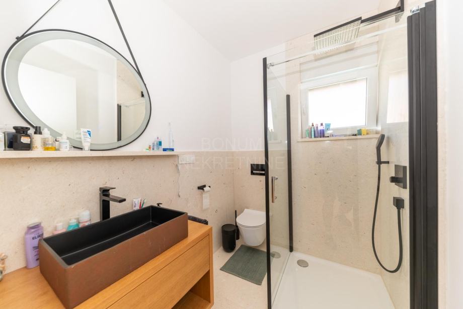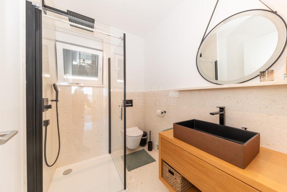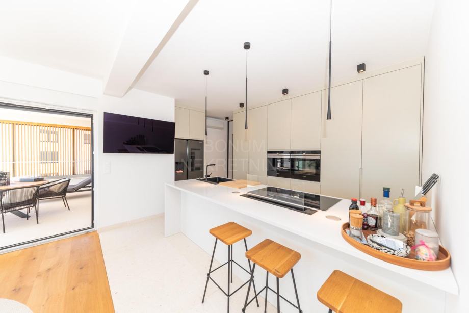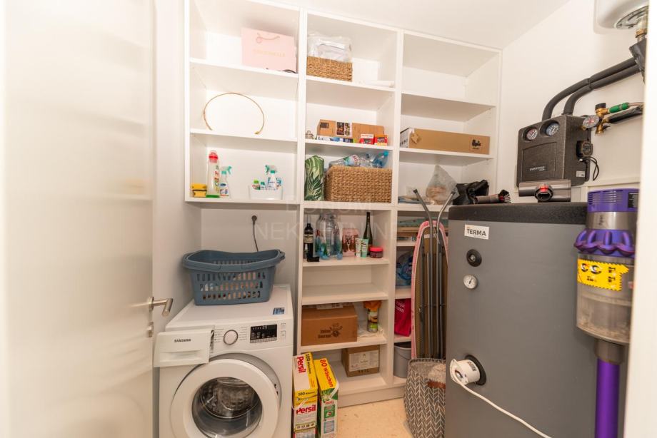 Posebnu vrijednost apartmanu daju dvije natkrivene terase, jedna s jugozapadne strane površine 19,30 m² i druga s jugoistočne strane površine 18,54 m², koje nude prekrasan pogled na more i stvaraju savršen prostor za odmor i druženje. Uz stan dolaze i pripadci: u podrumu dva parkirna mjesta površine 20,30 m² i 18,10 m² te natkriveni dio garaže od 4,69 m², a u dvorištu dodatno parkirno mjesto od 12,60 m² i dvorišni prostor površine 11,35 m².