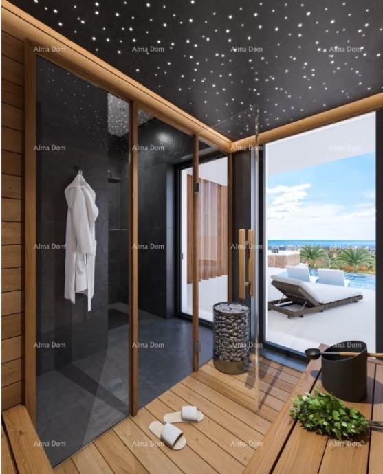 Infinity bazen je centar ove moderne vile, stvarajući iluziju spajanja vode s nebom ili morem u daljini. Jedan od zidova bazena je izrađen od prozirnog stakla, što stvara jedinstveni vizualni efekat. Uz sam bazen, odvojen samo prozirnim staklom nalazi se fire pit, još jedan očaravajući dodatak koji upotpunjuje ambijent vile. Fire pit, smješten u nivou bazena, pruža toplinu i romantičnu atmosferu, stvarajući savršeno mjesto za druženje i opuštanje. U večernjim satima, bljesak plamena odbija se od staklenog zida bazena, stvarajući zanosnu igru svjetlosti. Za potpuni doživljaj budući vlasnici će imati priliku opustiti se u elegantnoj sauni sa zvjezdanim nebom ili uživati u opojnom iskustvu jacuzzija na otvorenom.