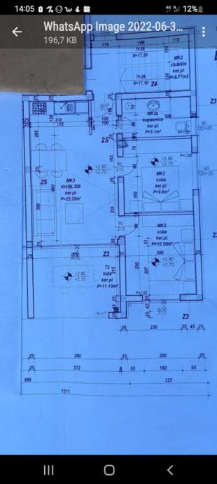 - kuhinje s blagavaonicom i dnevnim boravkom 23,55 m2, dvije spavaće sobe (9,60 m2 i 10,20 m2), kupaonice 5,10m2 = korisne vrijednosti površine 47,60 m2