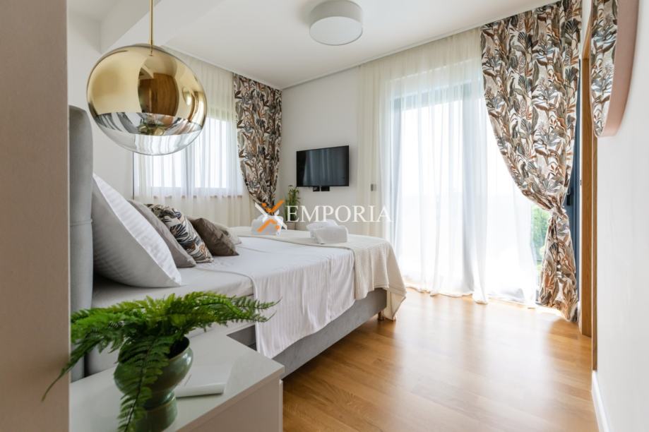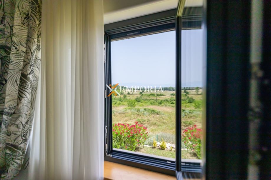 Raspored prostorija u prizemlju čine hodnik, wc, strojarnica, kuhinja s blagovaonicom i dnevnim boravkom te natkrivena terasa. Unutarnje stepenice vode dalje na prvi kat gdje se nalazi hodnik, spavaća soba s garderobom, kupaonicom i lođom, dvije spavaće sobe, kupaonica, praonica te lođa. Ukupna površina kuće je 156,30 m2 U dvorištu se nalazi lijepo uređena konoba s unutarnjim roštiljem i kupaonicom, savršena za druženja i proslave. Osim toga, tu je i prostrano spremište uz bazen.