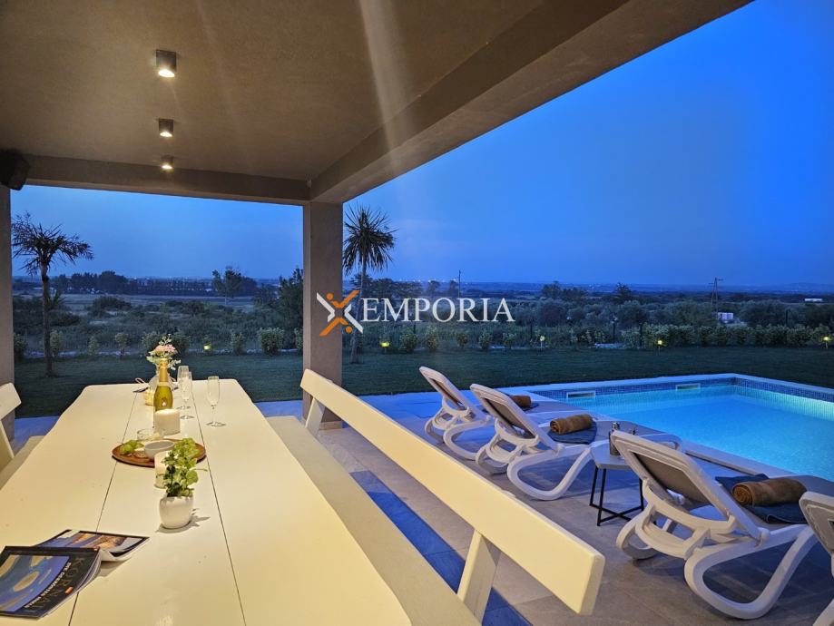 Die Raumaufteilung im Erdgeschoss besteht aus einem Flur, einer Toilette, einem Maschinenraum, einer Küche mit Esszimmer und Wohnzimmer sowie einer überdachten Terrasse. Die Innentreppe führt in den ersten Stock, wo sich ein Flur, ein Schlafzimmer mit Kleiderschrank, ein Badezimmer und eine Loggia, zwei Schlafzimmer, ein Badezimmer, eine Waschküche und eine Loggia befinden. Die Gesamtfläche des Hauses beträgt 156,30 m2. Im Hof befindet sich eine wunderschön dekorierte Taverne mit Innengrill und Badezimmer, perfekt für Zusammenkünfte und Feiern. Darüber hinaus gibt es neben dem Pool einen geräumigen Abstellraum.