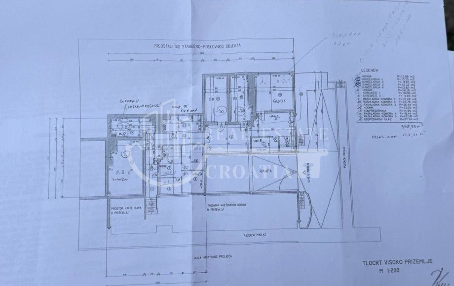 Prostor se sastoji od 20 prostorija raspoređenih kroz podrum, prizemlje i visoko prizemlje, a u sklopu objekta nalazi se i skladišni dio površine 337 m².Zgrada je izgrađena 1980. godine, a zadnja adaptacija provedena je 2008.