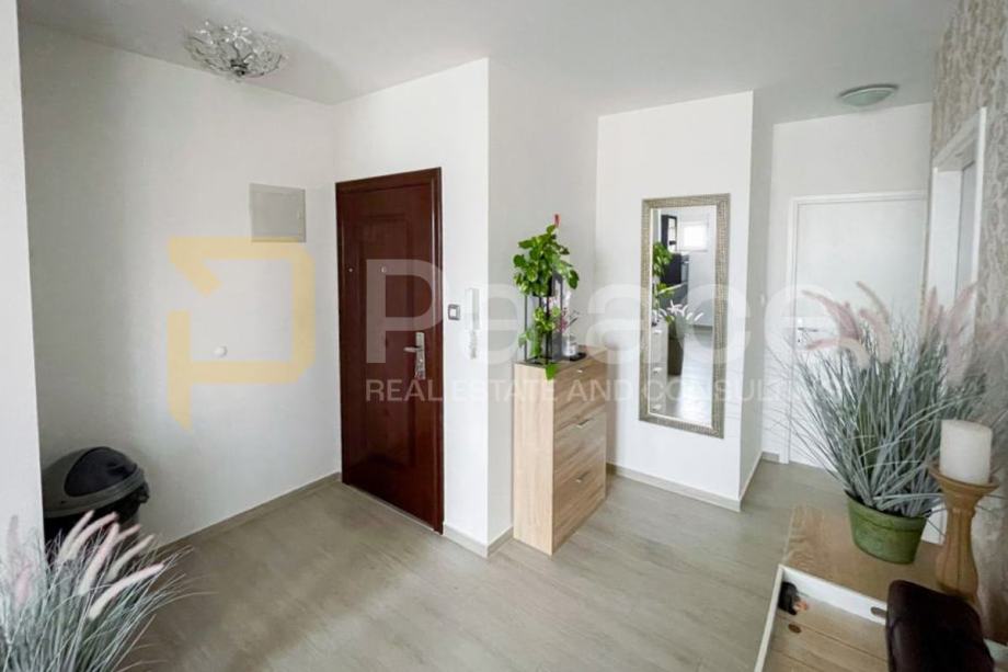 Prilikom ulaska u stan dolazite u prostrani hodnik koji osigurava privatnost i udobnost. Iz hodnika se ulazi u svijetli dnevni boravak povezan s moderno opremljenom kuhinjom i blagovaonicom. Iz dnevnog boravka se kroz staklenu stijenu izlazi na balkon, idealan za opuštanje na svježem zraku ili uživanje u pogledu na okolno zelenilo.