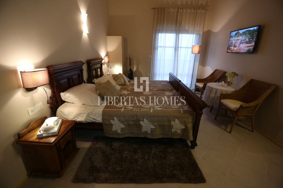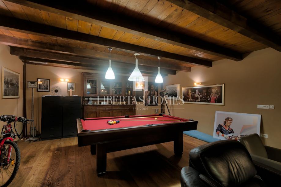 Prostrani interijer obuhvaća podrum s konobom i vinotekom, dok se u prizemlju nalaze kuhinja, dnevni boravak, spavaća soba s kupaonicom, spremište, wc i terasa. Na katu su dvije spavaće sobe, svaka s vlastitom kupaonicom i balkonom.
