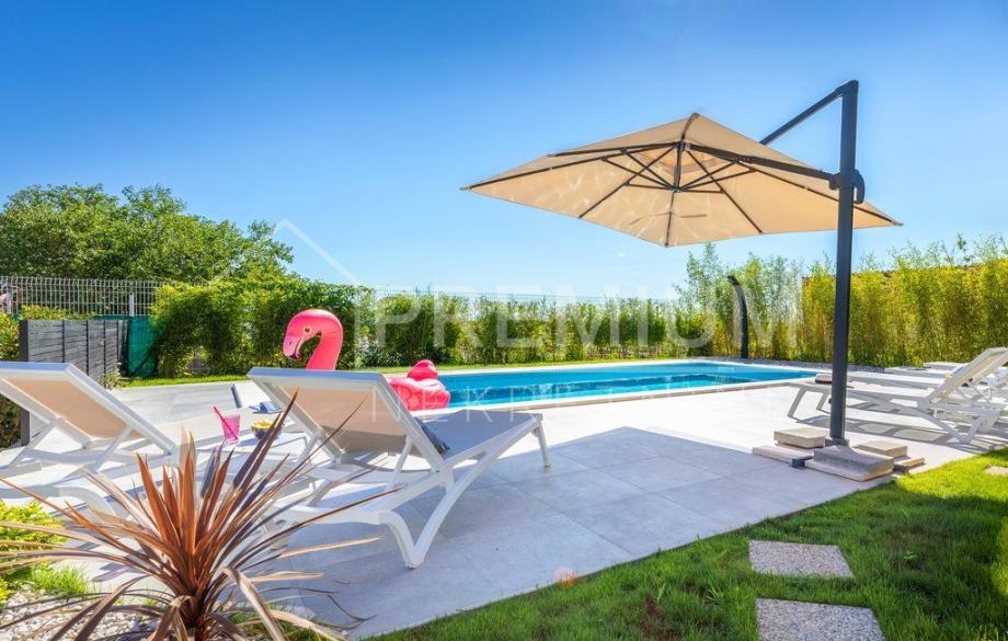 Okućnica je u potpunosti ograđena te se sastoji od bazena površine 30 m2, vanjskog tuša, sunčališta, uređene zelene površine i izdvojenog parkirališta u kojem se komotno mogu parkirati četiri automobila.