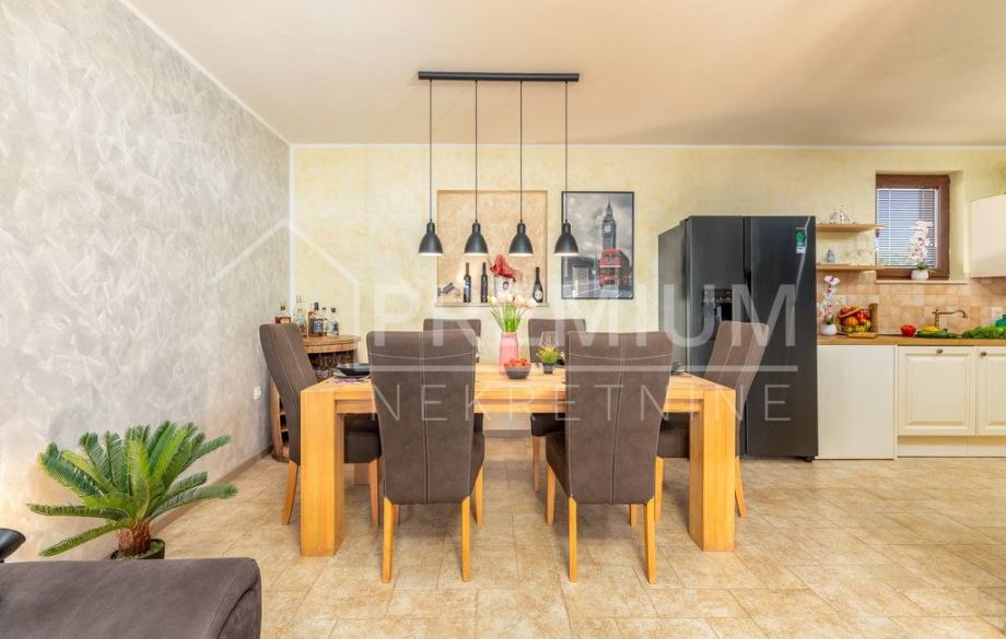 Kuća je koncipirana na način da se prizemlje sastoji od prostranog prostora u kojem je smještena blagovaonica, novoopremljena kuhinja, spremište, kupaonica i prostrana ljetna terasa.