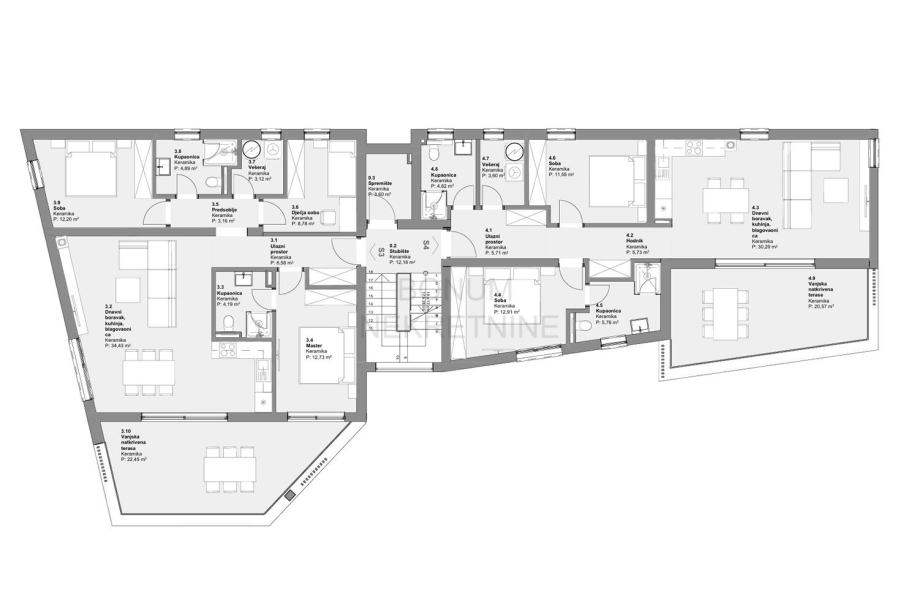 STAN S6( drugi kat)- sastoji se od ulaznog hodnika, dvije spavaće sobe, dvije kupaone, vešeraja, hodnika te vanjske natkrivene terase.