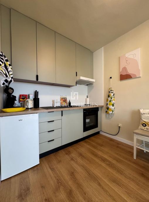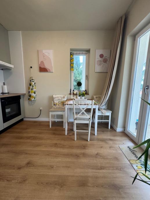 Stan se sastoji od kuhinje s blagovaonicom iz koje se izlazi na veliki, natkriveni balkon, s kojeg se zbog povišene pozicije zgrade pruža otvoren i ugodan pogled na prirodu, što omogućuje kvalitetan boravak i uživanje na otvorenom. Nadalje, stan obuhvaća manji dnevni boravak, spavaću sobu te kupaonicu. Dodatnu vrijednost nekretnini daje vrt bruto površine 45 m².