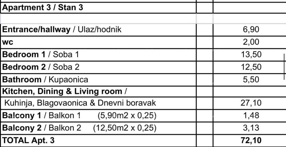 Stan se sastoji od ulaznog hodnika, dnevnog boravka+kuhinja+blagovaona, 2 spavaće sobe, kupaonice, WC i 2 balkona.