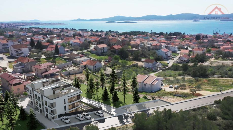 Prodaje se dvosobni stan u Svetom Filip i Jakovu sa krovnom terasom, iz stana i sa terase sa pruža panoramski pogled na more i otoke. Stan se sastoji od hodnika 6,64m2, soba 1 od 9,86m2, soba 2 9,96m2, kupaonica 5,56m2, dnevni boravak+blagavaona+kuhinja otvoreni prostor od 28,28m2 i WC 1,74 m2. Stan ima jednu nenatkrivenu terasu od 16,88m2, balkon 9,90m2, nenatkrivenu krovnu terasu od 81,54m2, vanjsko spremište 2 m2, te parkirno mjesto 12,50 m2. Ukupno korisne neto površine stana 95,85 m2. Zgrada se sastoji od 6 stanova. Vrlo je moderne i kvalitetne gradnje. Energetski razred A+. Opremljen sa klima uređajima u svim prostorijama, centralnim grijanjem, dimnjakom, protuprovalnim vratima, stolarija sa tri stakla sa električnim podizačima roleta.