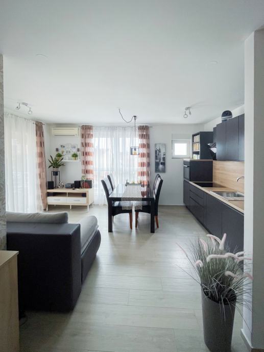 Stan se nalazi na prvom katu i sastoji se od dvije spavaće sobe, kupaonice, blagovaonice sa kuhinjom i dnevnim boravkom, hodnika i balkona. Orijentiran na jugozapad i jugoistok. Stan je udaljen cca 350m od plaže i mora, a u neposrednoj blizini se nalazi trgovina i javni prijevoz. Zgrada je na odličnoj mirnoj lokaciji, koja nije blizu prometnica.