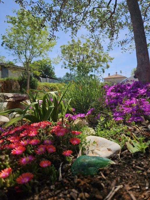 mali vrt s maslinom ispred balkona — idealno za odmor, kućne ljubimce i privatnost