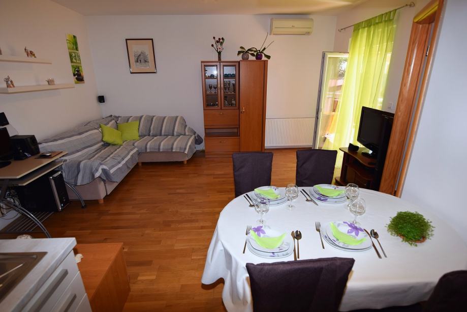 Stan se sastoji od dvije spavaće sobe, dnevnog boravka, kuhinje s blagovaonicom, kupaonice, te ima izlaz na terasu i vlastiti vrt, idealno za ugodan obiteljski život ili opuštanje na otvorenom.