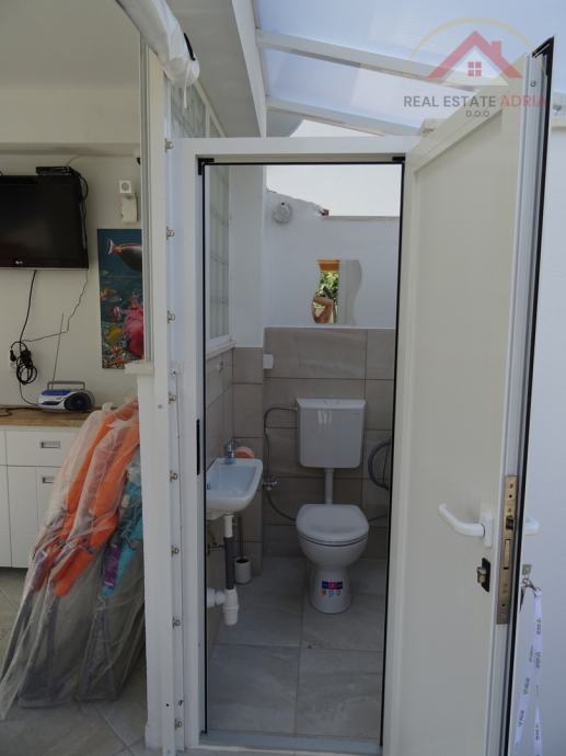 Pomoćni prostori; podrum, alatnica, u mjesnoj lučici vez za čamac do 6 m, vez u uvali za 3 čamca i poluprivatno kupalište na moru sa suncobranom i stolicama.