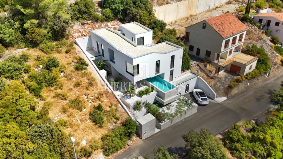 Ova izvanredna nekretnina nalazi se svega oko 70 metara od mora, na zemljištu od 530 m², i nudi savršenu kombinaciju privatnosti, mira i neposredne blizine plaže. Unutrašnjost od 250 m² raspoređena je u četiri luksuzne spavaće sobe, svaka s vlastitom kupaonicom, od kojih tri imaju izlaz na privatne terase s panoramskim pogledom na more ili vrt. Otvoreni središnji prostor zamišljen je za kuhinju po mjeri s otokom, barom i panoramskim dnevnim boravkom, koji se elegantno nastavlja na južnu terasu i preljevni bazen od 38 m², tehnički pripremljen za ugradnju grijača. Vila također ima 120 m² prekrasnih terasa koje savršeno nadopunjuju prostrani dnevni boravak.