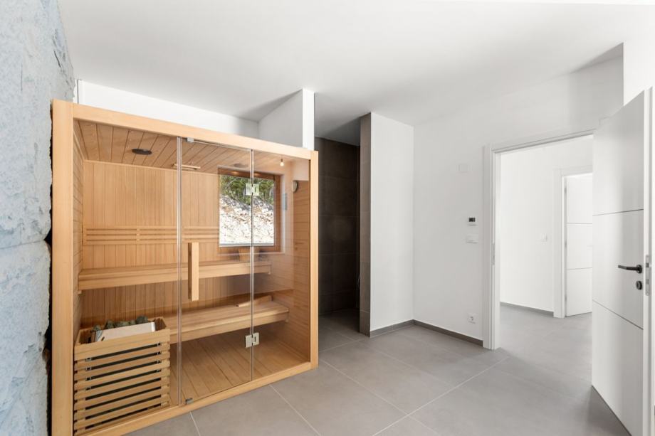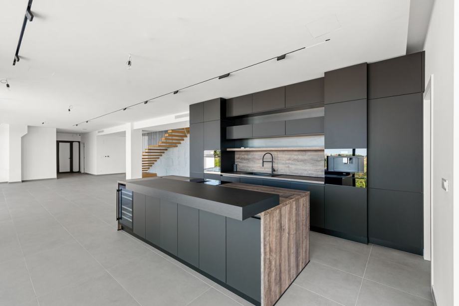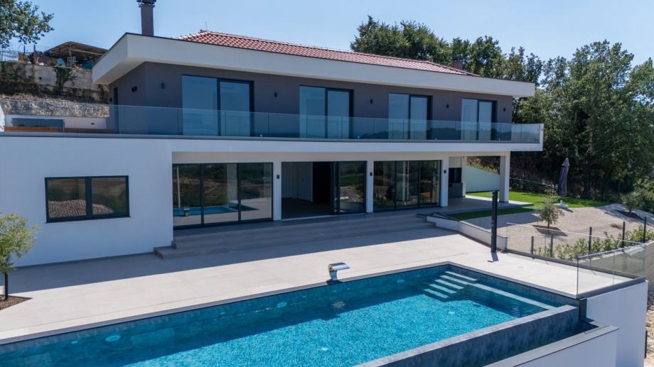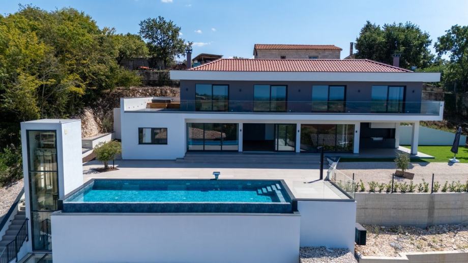 Kuća suvremene arhitekture nalazi se na građevinskom zemljištu od 1 094 m2. Parcela je potpuno komunalno uređena. Kuća će biti priključena na struju, vodu, kanalizaciju, asfalt, a mogući je i priključak na telefonsku mrežu. Kuća će biti tlocrtne veličine 26x11 metara u prizemlju, infinity bazen 12x4 metara korisne vodene površine. Ispod bazena strojarnica i ostava od 20 m2. Posebnost ove građevine čini dizalo koje će biti uz bazen za savladavanje visinske razlike od ceste do ulaza u kuću od 7 metara. Ispred bazna je popločeno sunčalište od 100 m2. Kuća je ukupne neto stambene površine 419 m2. U prizemlju centralnog dijela nalazi se veliki otvoreni prostor dnevnog boravka s kaminom i kuhinja, ostakljen podizno kliznim stijenama. Uz to u prizemlju se nalazi prostorija s unutarnjem jacuzziem, saunom i gostinjskim WC-om. Jedna prostorija namijenjena je za teretanu, te kuća ima jedan polivalentni prostor za društvene igre. Uz to sadržava vanjsku ljetnu kuhinju s roštiljem. Na katu su četiri spavaće sobe s vlastitim kupaonicama. Glavna spavaća soba ima walk-in ormar i izuzetno je velike površine. Svaka spavaća soba ima veliku podiznu kliznu stijenu za uživanje u jedinstvenom pogledu, te izlaz na zajedničku terasu.