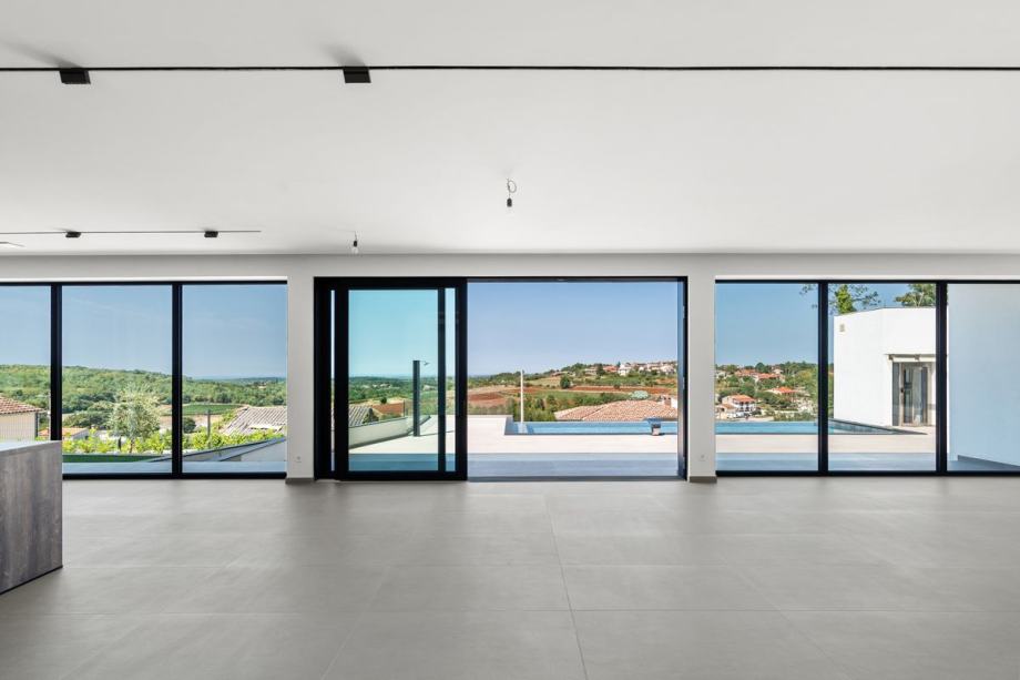 - Alu stolarija u antracit boji, velike staklene površine, pretežno podizne klizne stijene