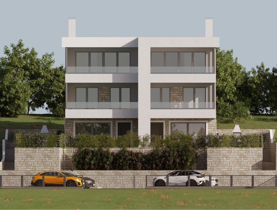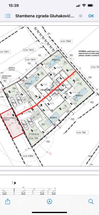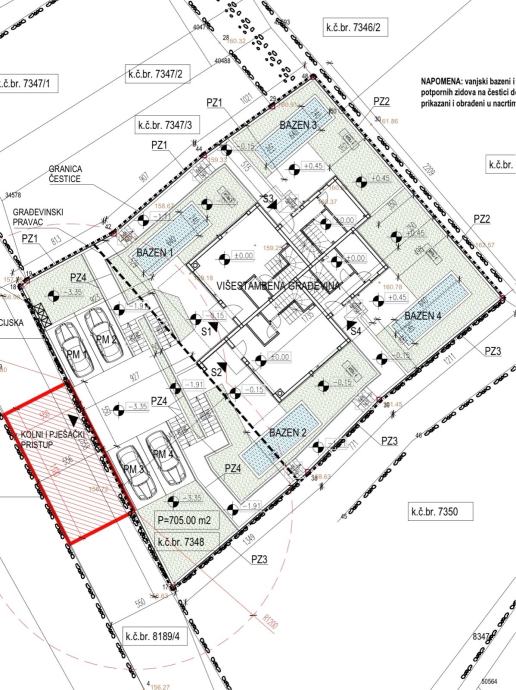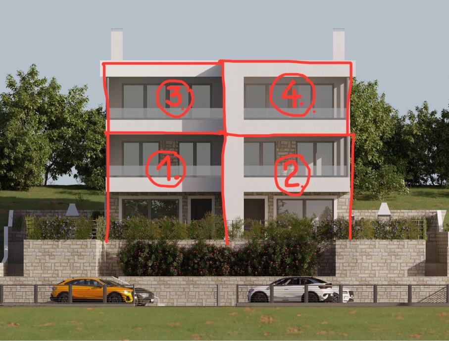 Višestambena građevina s 4.stambene jedinice,(2-Trosobna -dvoetažna i 2.Četverosobna -troetažna stana )četiri vanjska bazena,sa posebnim ulazima i vlastitim okučnicama.”.(Stan S1-88,10m2,Stan S2-88,20.m2,Stan S3-106.90.m2,Stan S4-106.90.m2).Ukupno =390.10m2 Netto korisne površine.