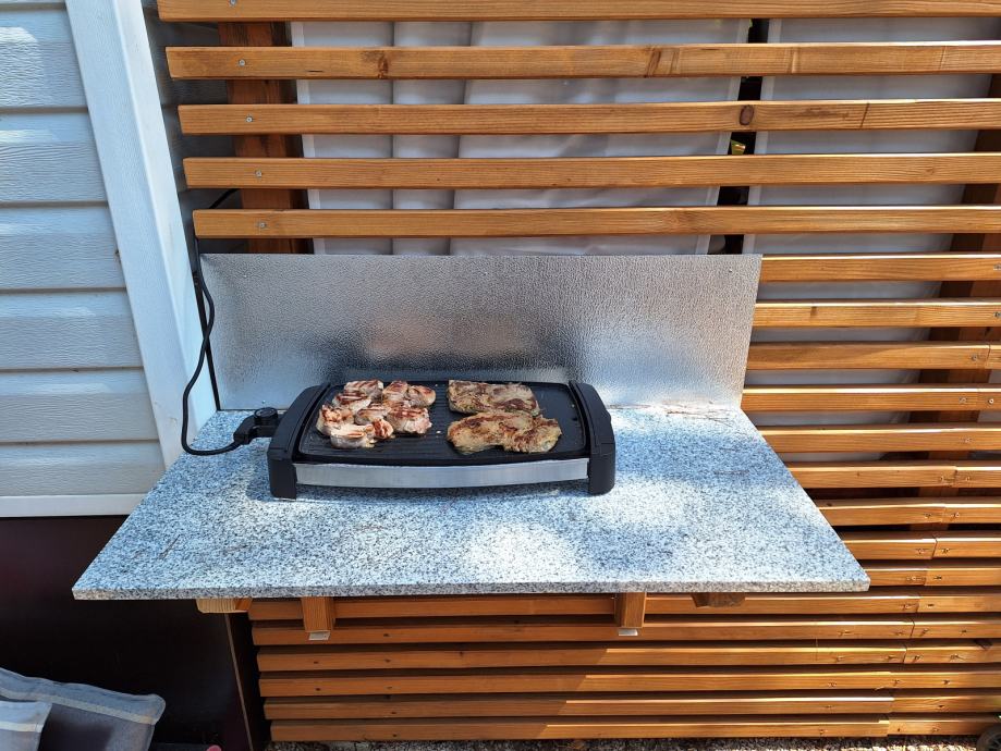 Terasa je opremljena sjedećom garniturom, velikim stolom i stolicama. U opremu ulazi još i novi električni roštilj s pripadajućim spremištem/postoljem za njegovo korištenje.