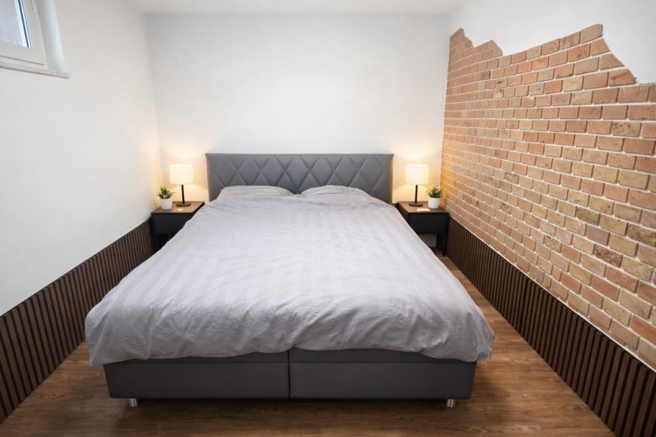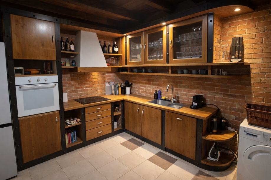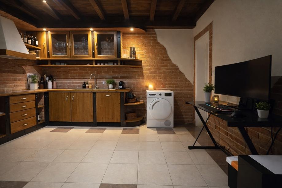 Stan se sastoji od prostranog dnevnog boravka s kuhinjom i blagovaonicom, spavaće sobe i kupaonice. Kuhinja je velika i funkcionalna, s dovoljno prostora za svakodnevno korištenje i blagovanje.