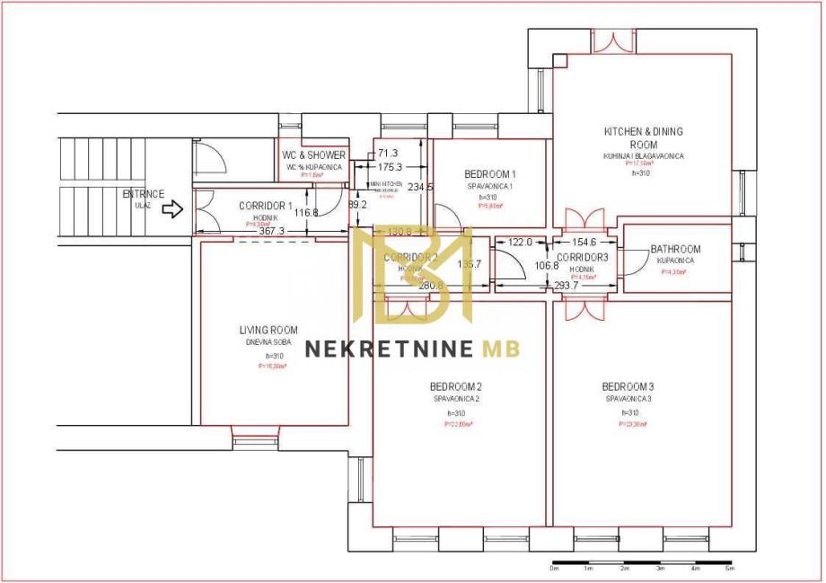 Stan je neto površine 106m2 a sastoji se od 2 velike spavaće sobe, 1 manje spavaće sobe, dnevnog boravka, kuhinje,blagavaonice, 2 kupaonice,te još jedne pomoćne kuhinje i hodnika.