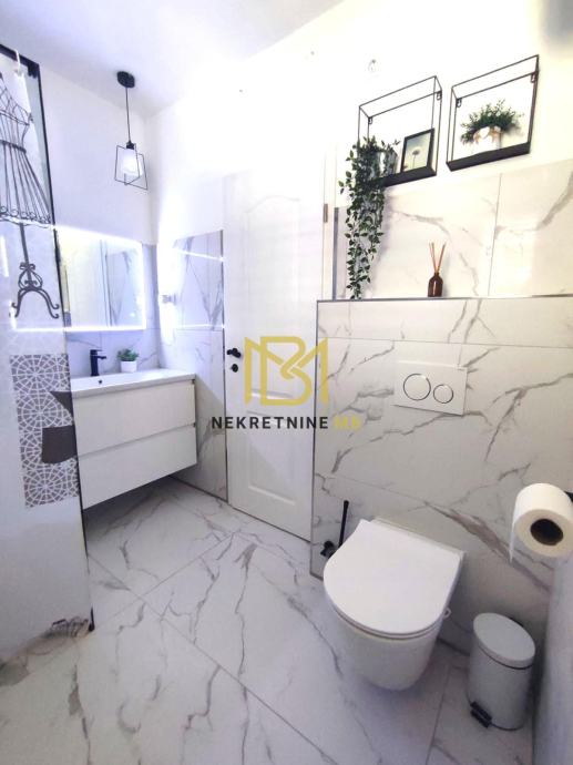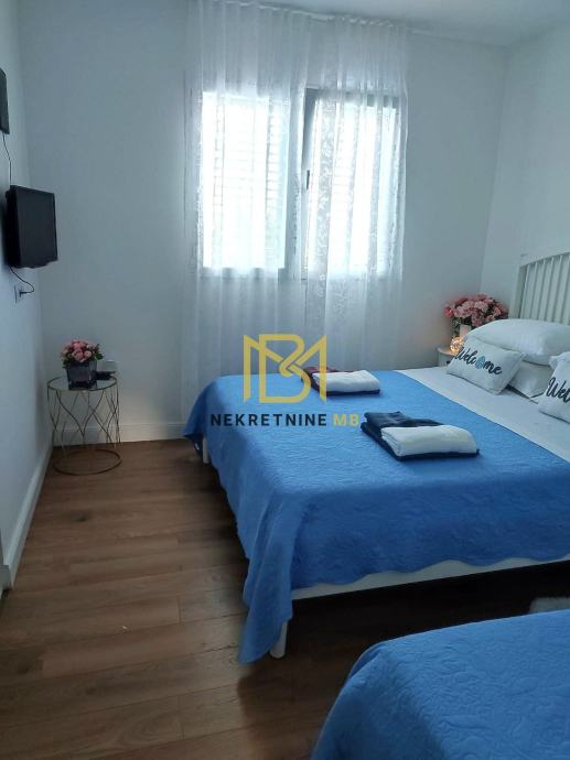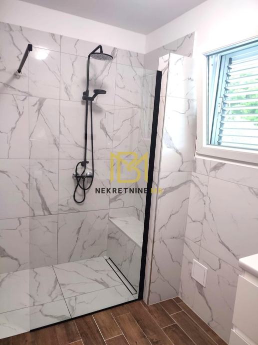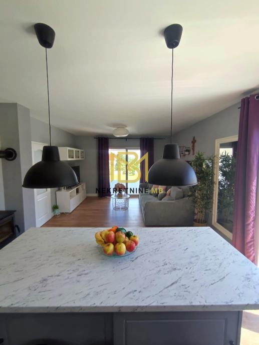 Grijanje na drva i klimu, u tijeku ugradnja multi-split sustava s dizalicom topline. Kuhinja i ugradbeni namještaj po mjeri s aparatima uključeni u cijenu.