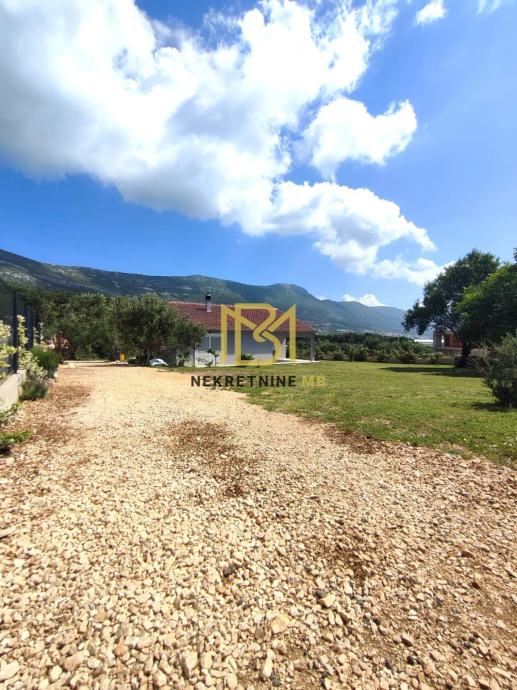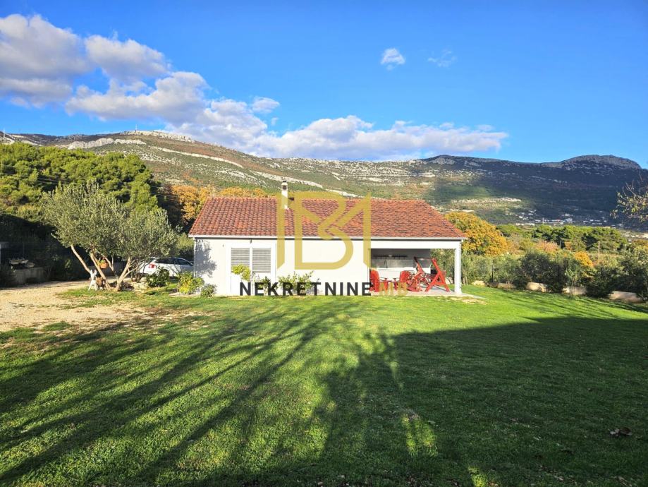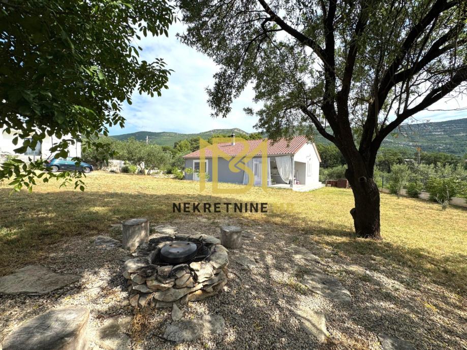 Uređena okućnica od 1100 m² zasađena je maslinama, smokvama, agrumima i mediteranskim biljem. Parcela je ograđena, ima vlastiti prilazni put, struju, vodu, biološku jamu, telefon, i djelomičan pogled na more. More udaljeno 2 km, trgovina 400 m.