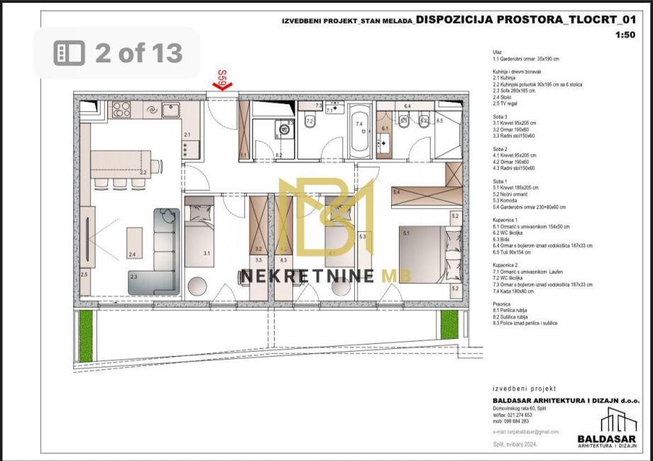 Stan se sastoji od prostranog dnevnog boravka sa kuhinjom i blagovaonicom,tri spavaće sobe od kojih svaka uključujući i DB ima izlaz na prostran balkon,dvije kupaonice od kojih je jedna predviđena za master sobu,te praonice sa instalacijom za dvije perilice.