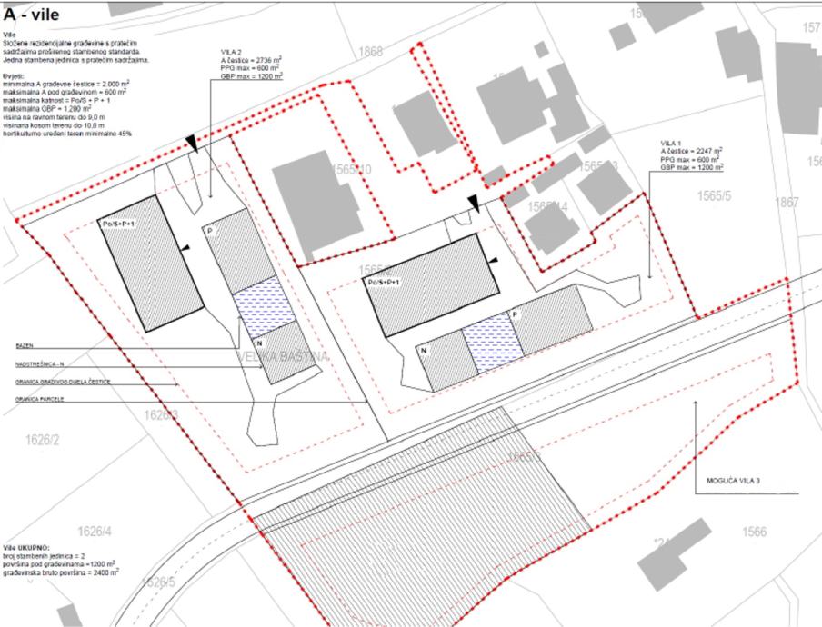 o Varijanta A: luksuzne vile s bazenima, pomoćni objekti, velike parcele (svaka do 1.200 m²)