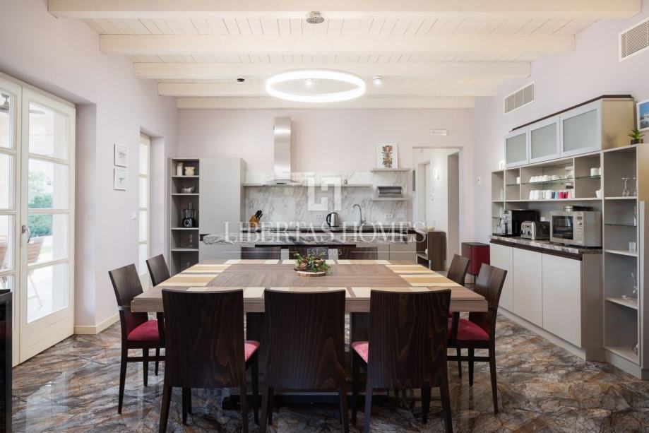 Kuhinja je potpuno opremljena najsuvremenijim uređajima, a prostrani dnevni boravak i blagovaonica s potpisanim namještajem pružaju savršeno mjesto za obiteljske obroke i društvena okupljanja. Vanjski prostor uključuje tradicionalnu istarsku natkrivenu terasu uz bazen, s prostorom za objedovanje do 12 osoba i vanjskom peći na drva.